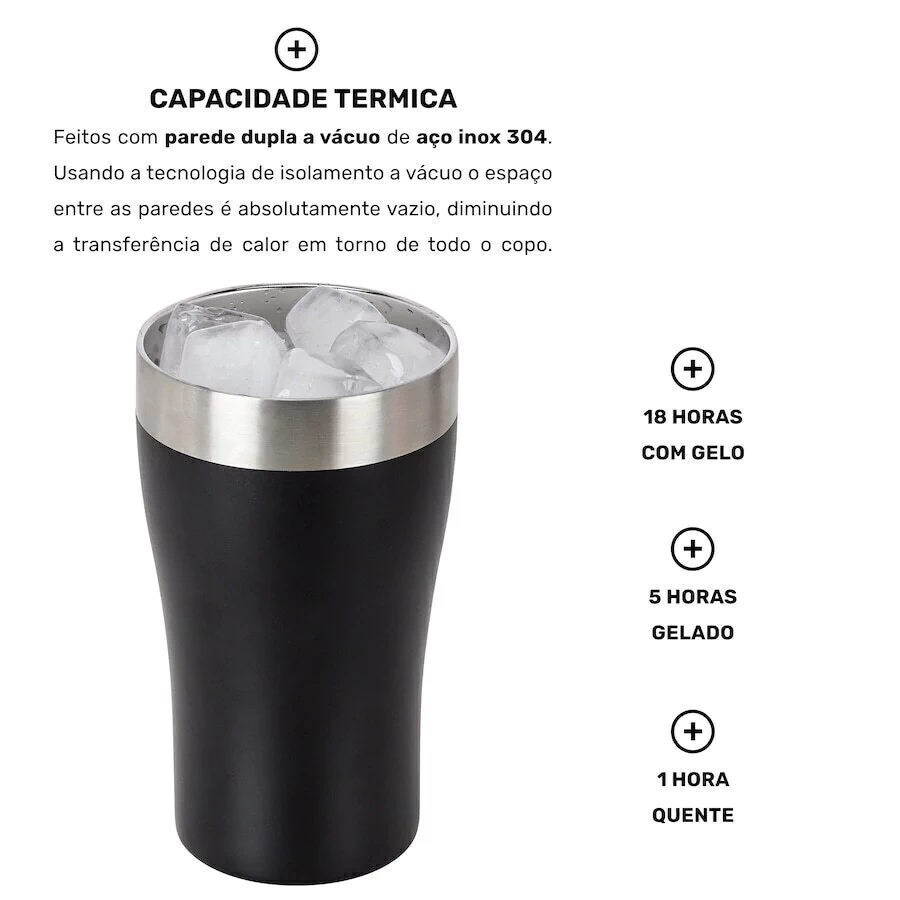 O copo mantém até 18 horas com gelo, 5 horas gelado e 1 hora quente, além disso, conta com o fundo emborrachado antirruído e pintura PVD.